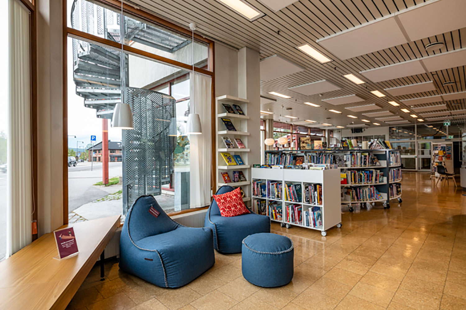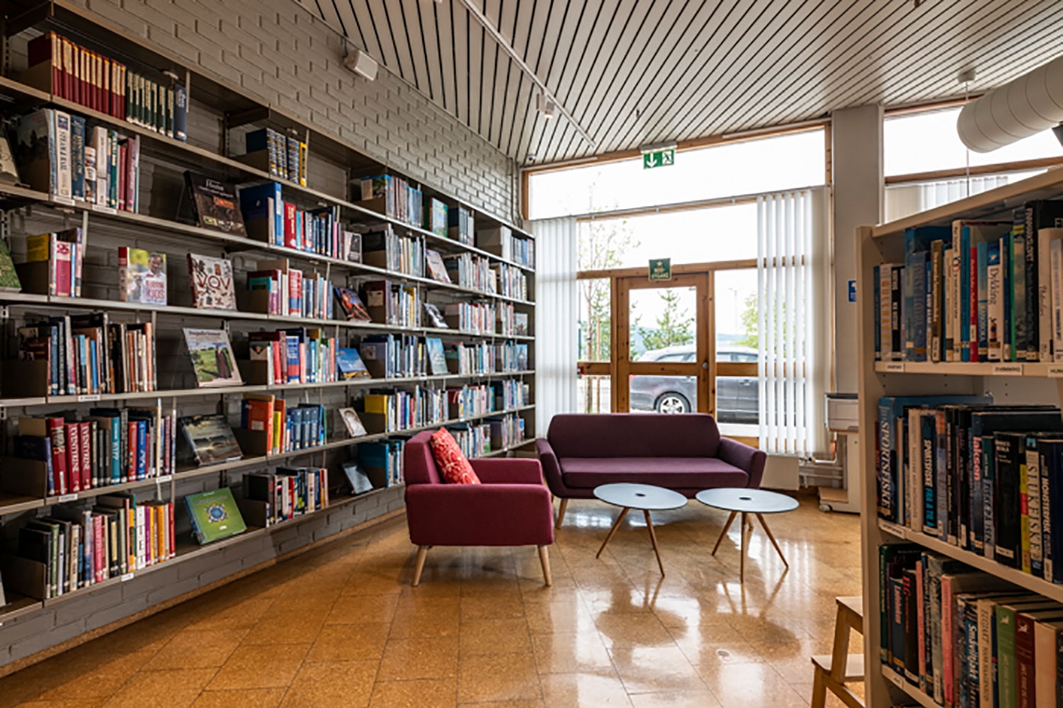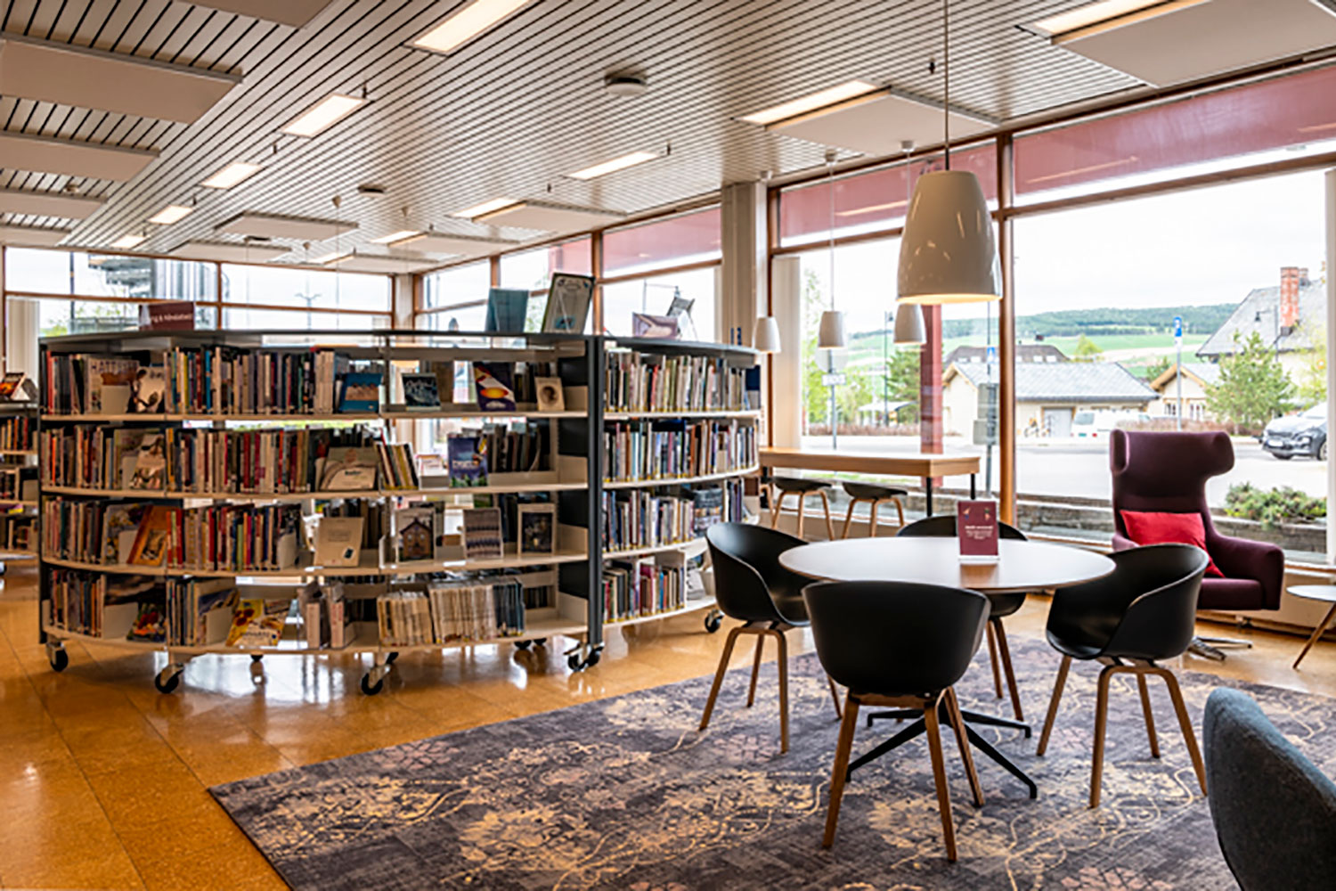 Flyttbara hyllskepp och möbler på hjul ger stor flexibilitet när lokalerna ska användas till arrangemang och aktiviteter. De högsta hyllorna är placerade längs väggarna och lägre hyllor används fristående runtomkring så att biblioteksrummet framstår som inbjudande med god överblick.