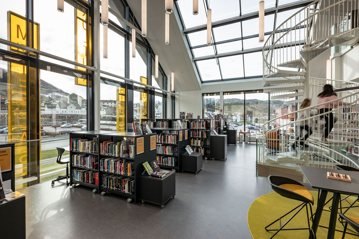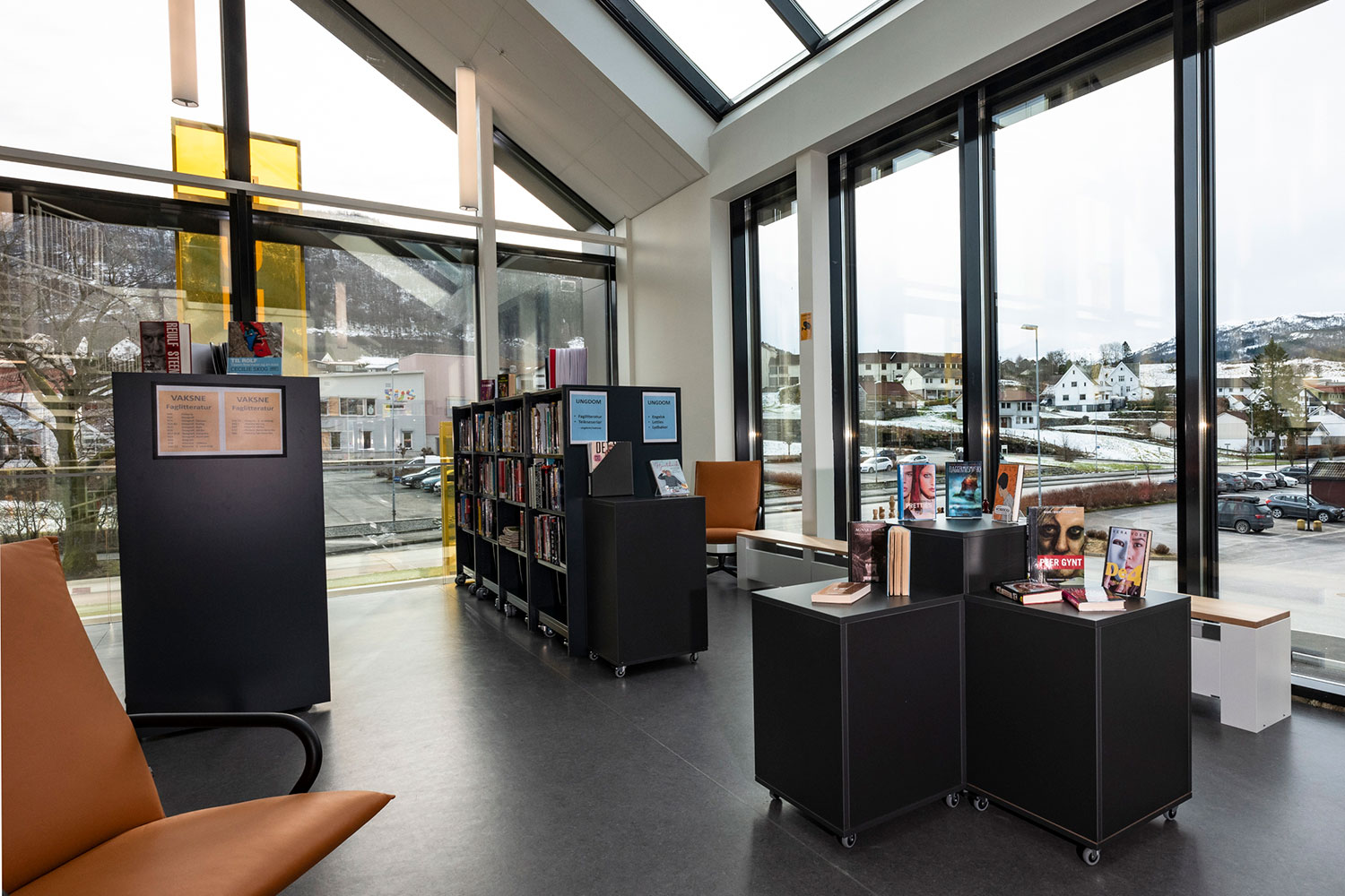 I anslutning till det befintliga kulturhuset i Ølen har biblioteket flyttat in i en ny och modern tillbyggnad. Det nya kultur- och lärcentret fördelar sig på tre våningar som förbinds av en elegant spiraltrappa.