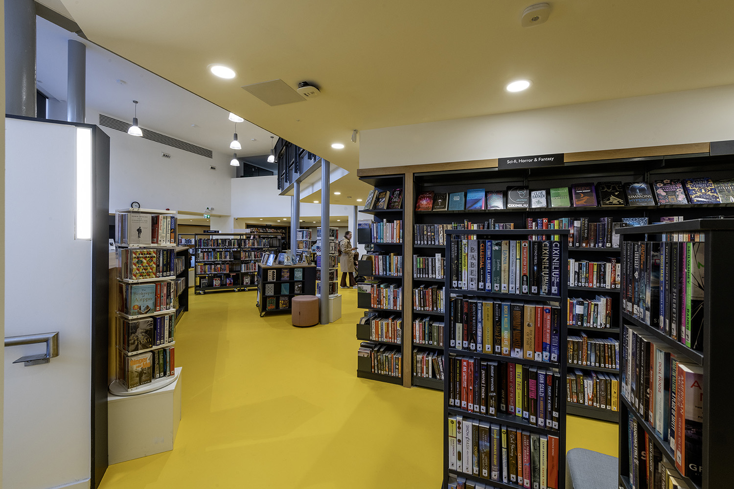 Själva hyllorna är tillverkade av hållbara material som ger värme och hållbarhet samtidigt som de kompletterar det naturliga ljuset som flödar in från de stora fönstren tack vare den fantastiska arkitektoniska utformningen av centret. De varma trätonerna bryts av med moderna accenter, bland annat metallarmaturer som anknyter till områdets industriella arv och på ett subtilt och sammanhängande sätt knyter samman dåtid och nutid.