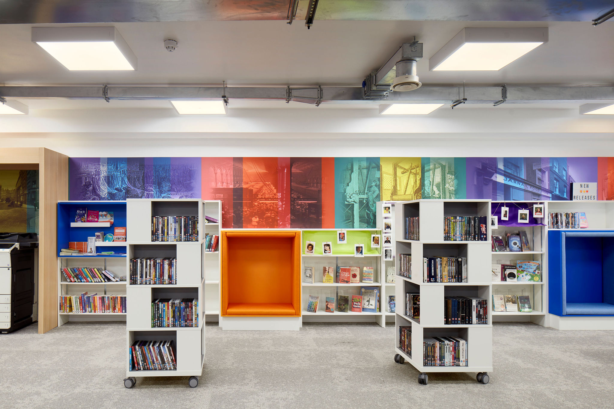 Vår uppgift på thedesignconcept ltd. var att skapa en modern, livfull och välkomnande design som återspeglar kvarterets kulturarv. Receptionsområdet har byggts om för att tillgodose behoven hos de boende i kvarteret och för att bättre kunna betjäna bibliotekets besökare, som främst är familjer med små barn och yrkesverksamma. De små och mobila hyllorna, grupperade i små öar, skapar större flexibilitet och utrymme för gruppaktiviteter, medan läshörnor kan användas för att dra sig tillbaka och njuta av en bok i tystnad.