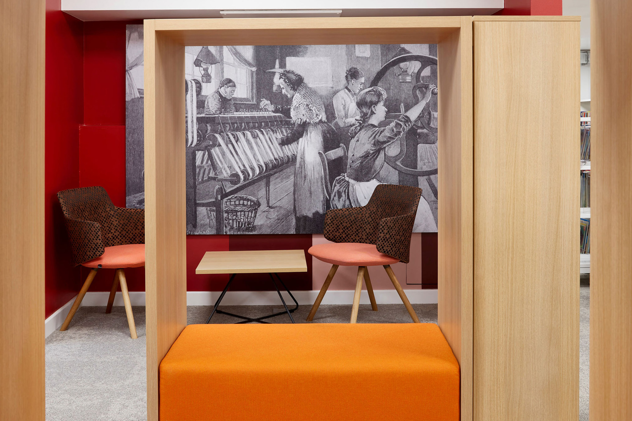 Alla vägghyllor har återanvänts och uppdaterats med moderna skyltar, och flera av de tidigare biblioteksmöblerna har också återinförts i den nya designen. Ett nytt loungeområde för grupparbete har tillkommit med nya möbler med integrerad strömförsörjning, så att besökarna kan koppla in sina egna enheter. Fler bärbara bord har lagts till runt om i biblioteket, vilket uppmuntrar besökare i alla åldrar att sitta var de vill.