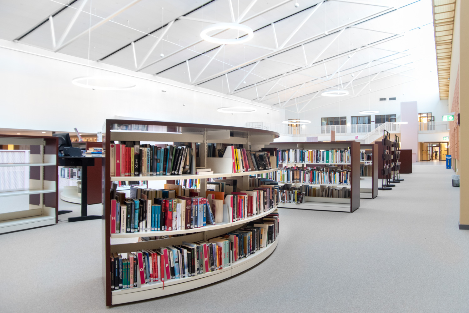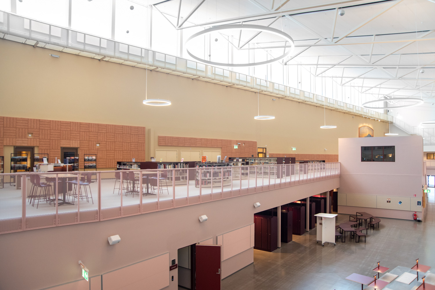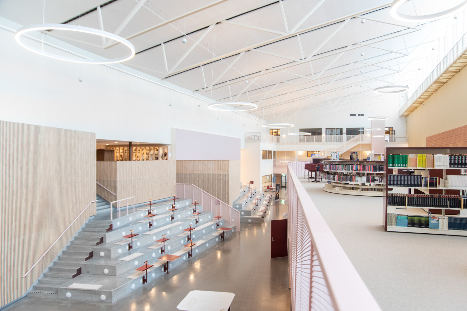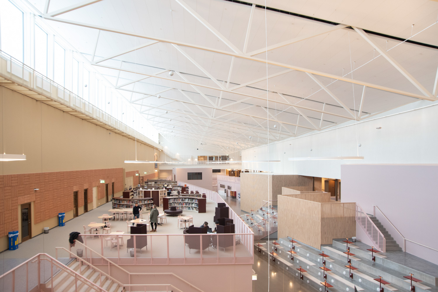 I hjärtat av byggnaden finns ett centralt torg som utgör en länk mellan kunskapsstaden och resten av stadskärnan. Härifrån leds besökaren in i ett rymligt atrium där stadens och skolans verksamheter möts i ett gemensamt och offentligt rum. Här ligger också biblioteket, där en generös mängd dagsljus kommer från stora glaspaneler på taket, vilket inbjuder besökarna att titta upp mot himlen och följa årstidernas olika skiftningar.