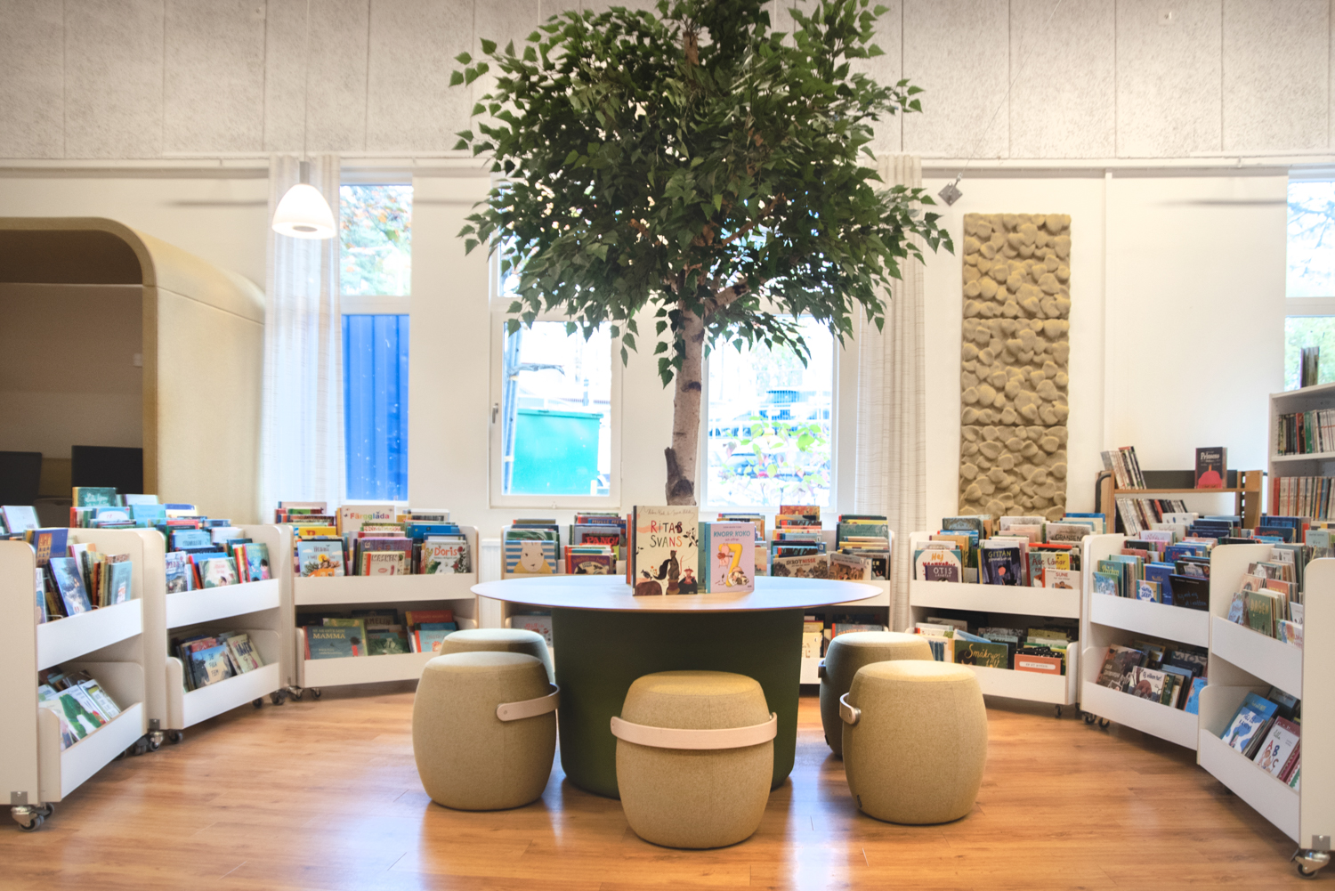 Biblioteksmöblerna hålls i företrädesvis vita färger kompletterade med gröna nyanser för att liksom flytta in lite av naturen i rummet.
