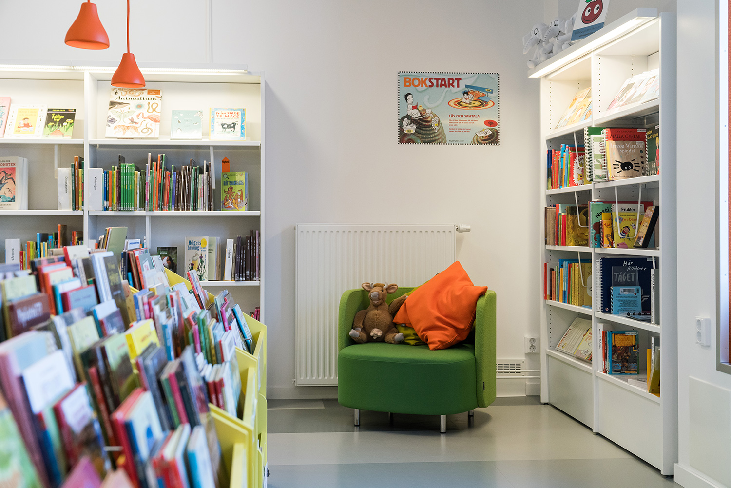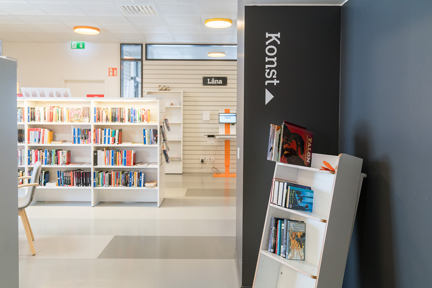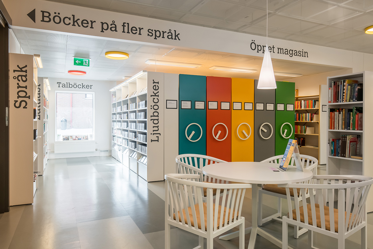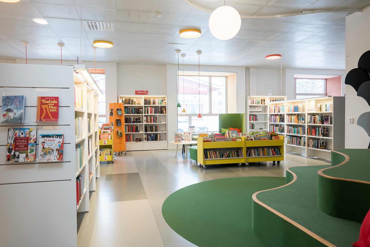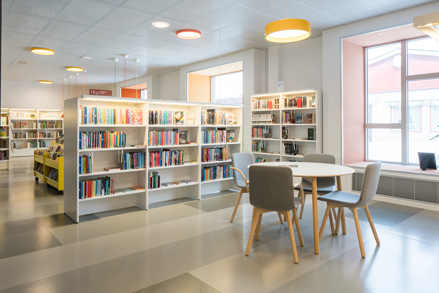 Biblioteket är inrett i lokaler, som drar fördel av de stora fönsterpartiernas naturliga ljusinsläpp. Resultatet är en ljus och välkomnande miljö. Här har man tänkt på alla åldersgrupper med bl. a. en attraktiv barnavdelning och flera läs- och studieområden med enkel åtkomst till bibliotekets utbud på de belysta hyllorna.