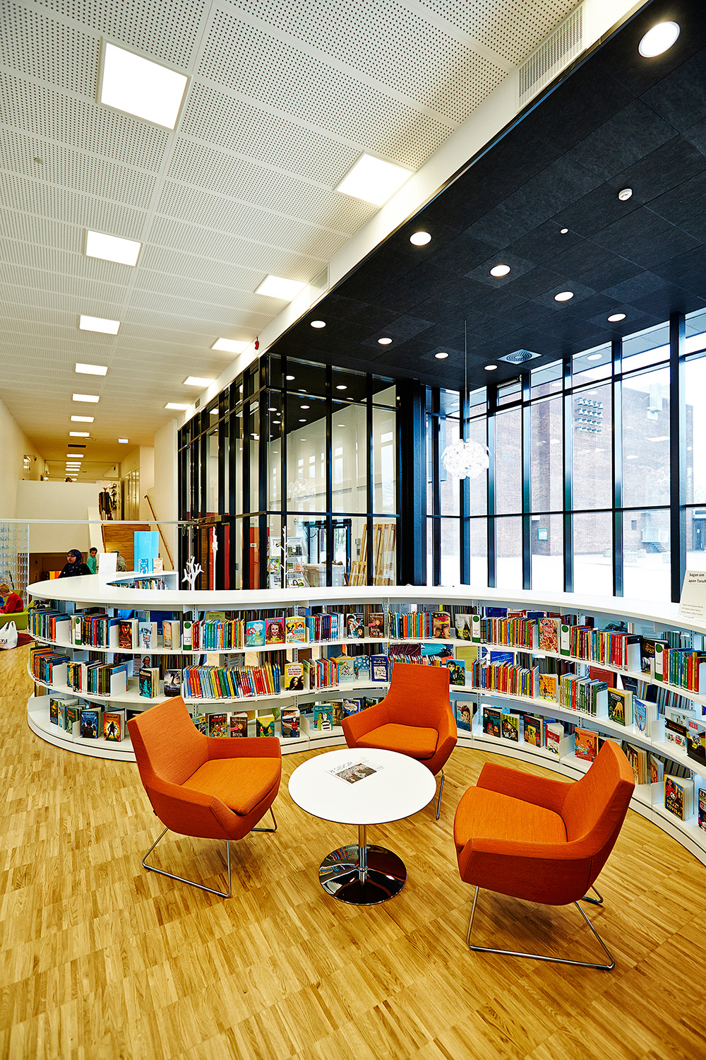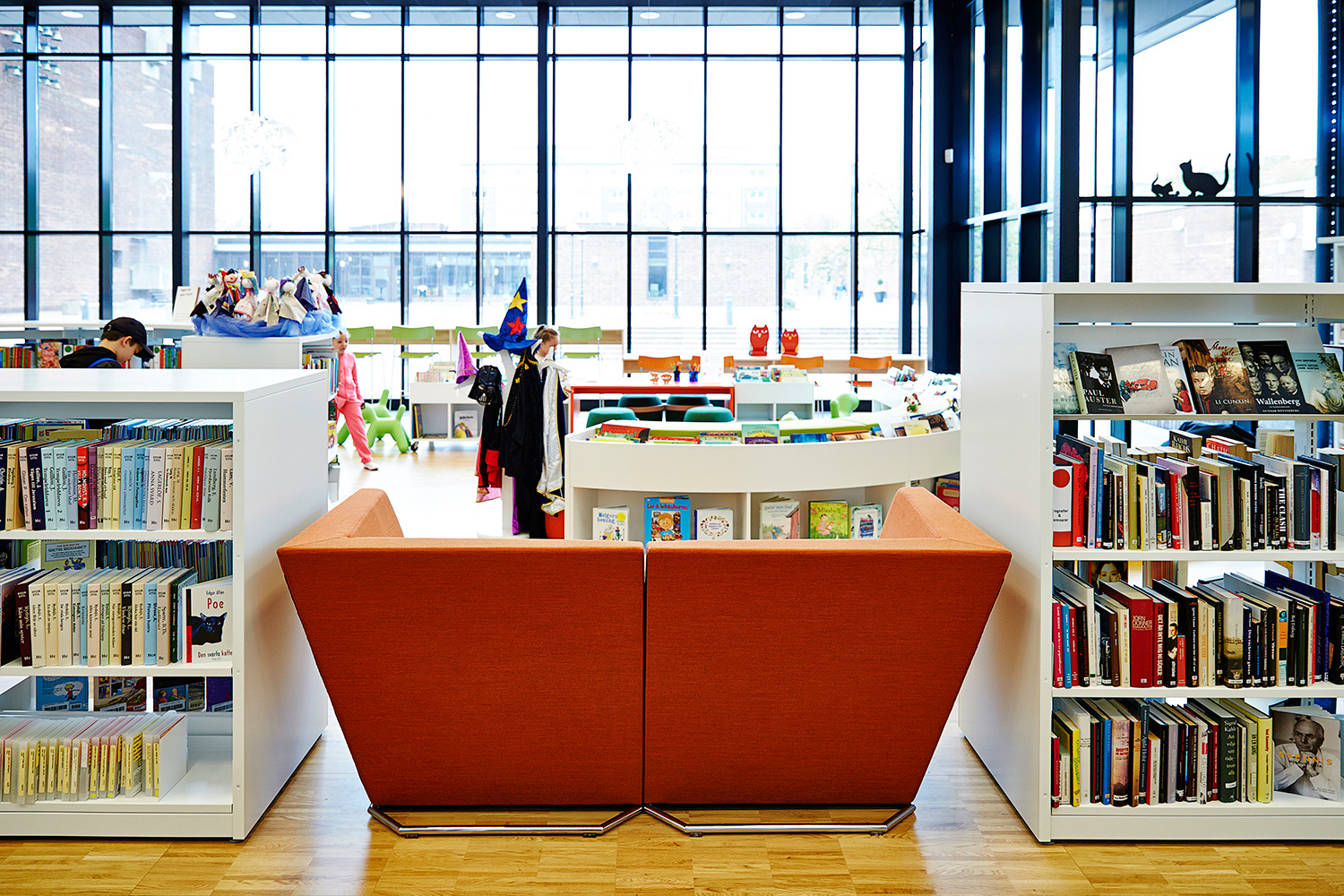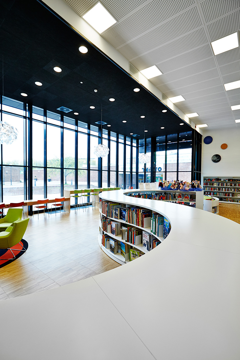 ”När det gäller inredningen så är jag speciellt glad över de långa sittbänkarna längs glaspartiet som vetter mot torget, för de förenar inne- och utemiljön så att de nästan smälter samman. Sedan växer inredningen inåt i rummet, så att de högsta möblerna är längst bak. Mycket effektfullt. Så har vi en fantastisk låg rund hylla, som slingrar sig som en orm genom biblioteksrummets mitt. Den liksom bara finns där och skapar vrår där barnen spontant upptäcker nya böcker.”