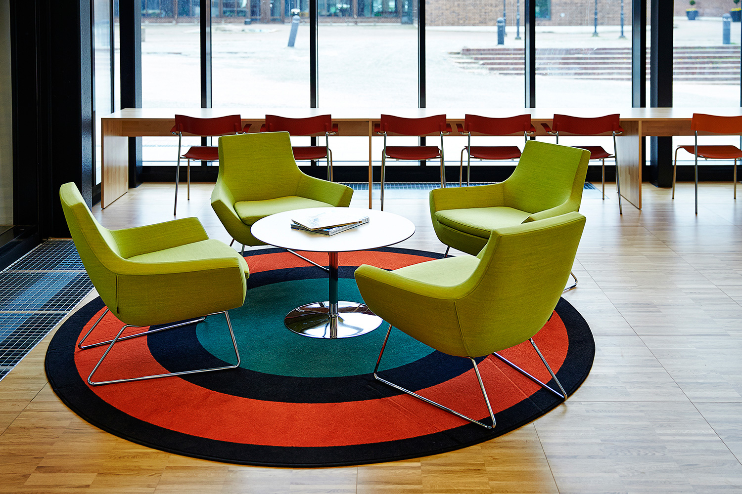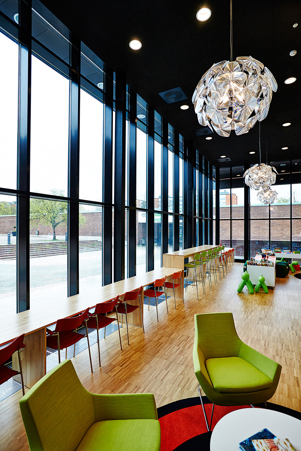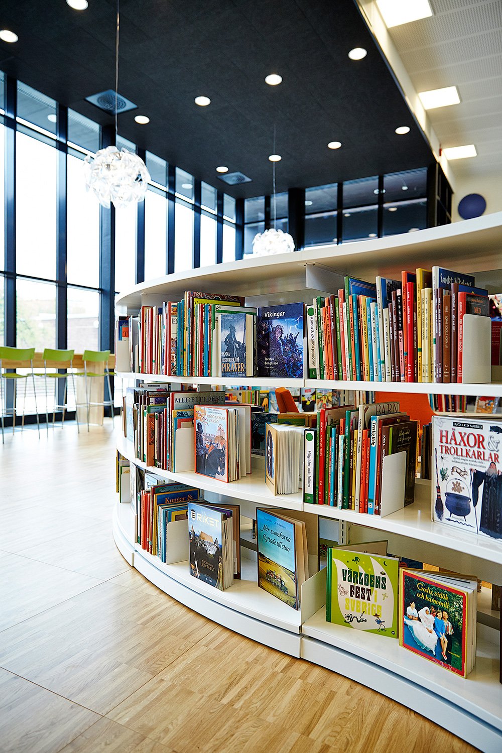 ”När det gäller inredningen så är jag speciellt glad över de långa sittbänkarna längs glaspartiet som vetter mot torget, för de förenar inne- och utemiljön så att de nästan smälter samman. Sedan växer inredningen inåt i rummet, så att de högsta möblerna är längst bak. Mycket effektfullt. Så har vi en fantastisk låg rund hylla, som slingrar sig som en orm genom biblioteksrummets mitt. Den liksom bara finns där och skapar vrår där barnen spontant upptäcker nya böcker.”