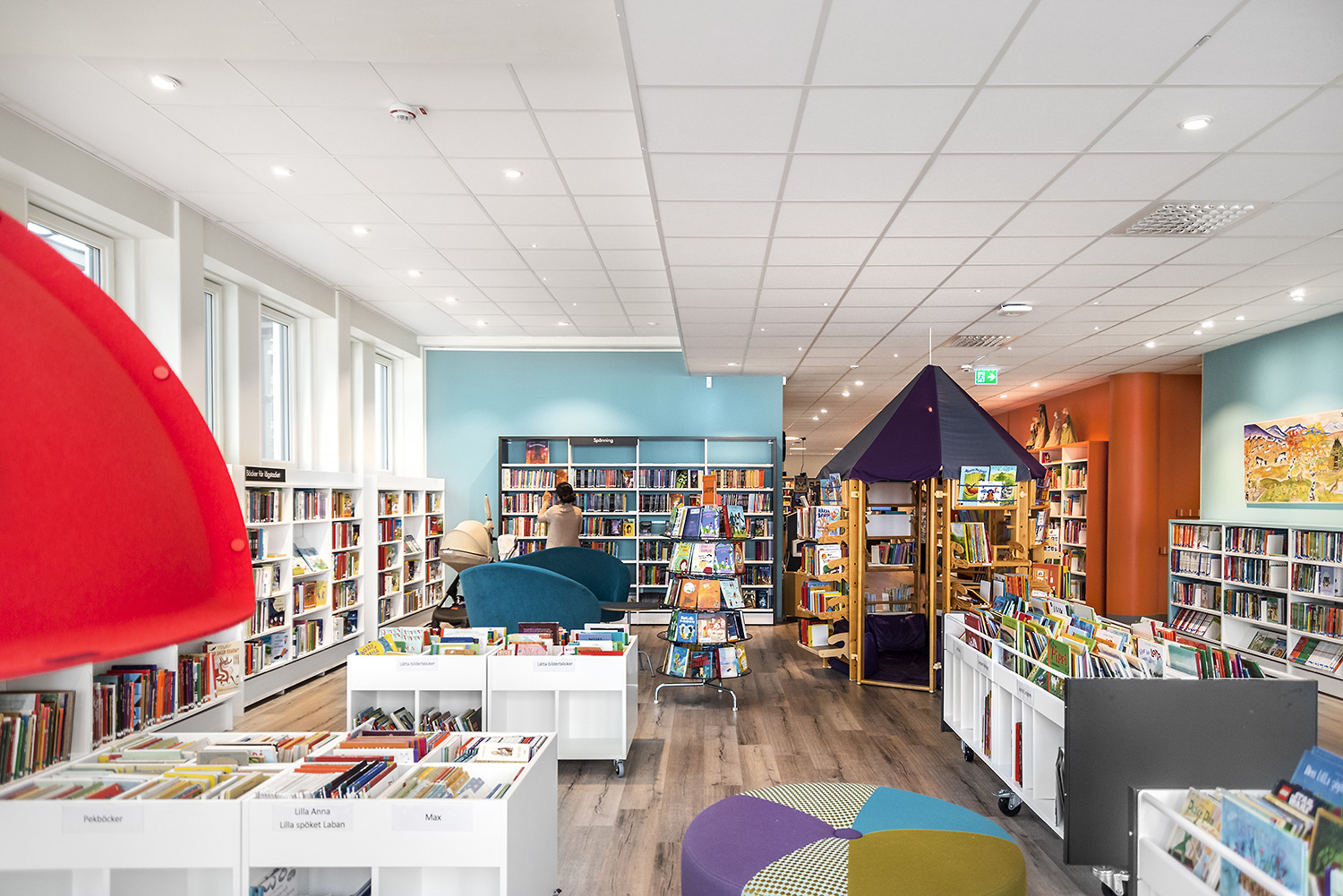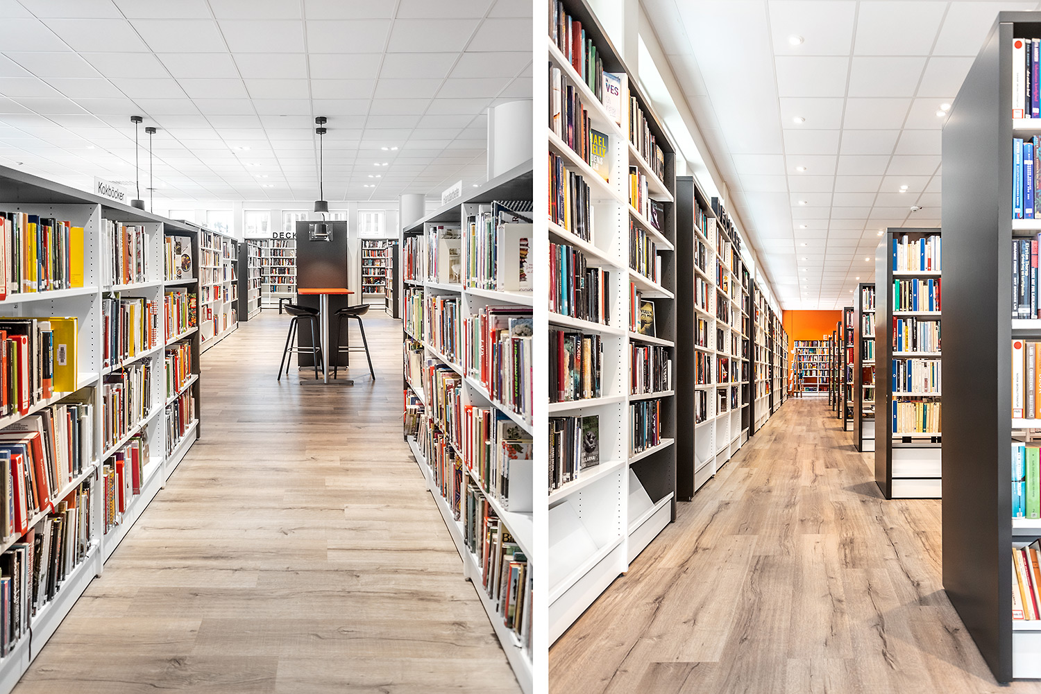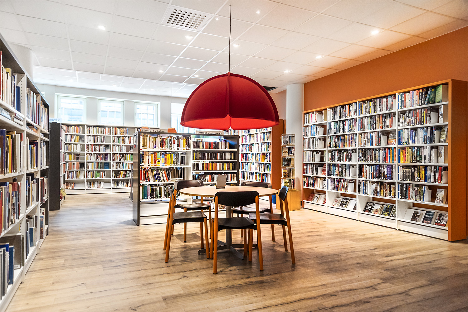 ”Ytterväggen mot torget var tidigare täckt av bokhyllor. Vi ville ha mer luft och ljus och öppnade därför upp större fönster i bokhallen. I ett slag fick vi då inte bara bättre ljus utan också högre hyllor som rymmer våra böcker.