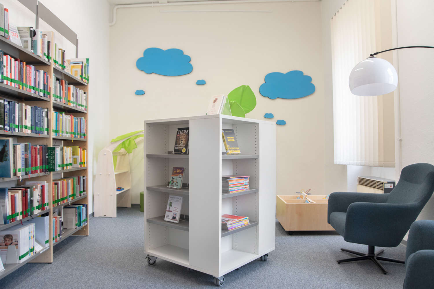 I biblioteket finns flera områden där man kan sitta ostört och det överordnade målet med biblioteksinredningen har varit att ta höjd för många olika behov.