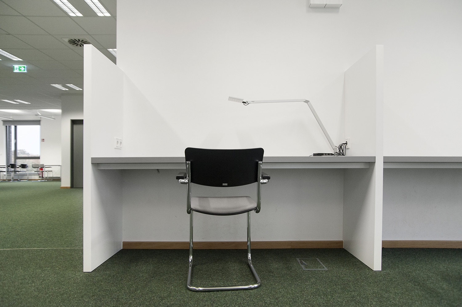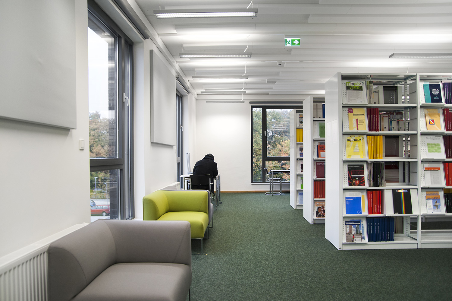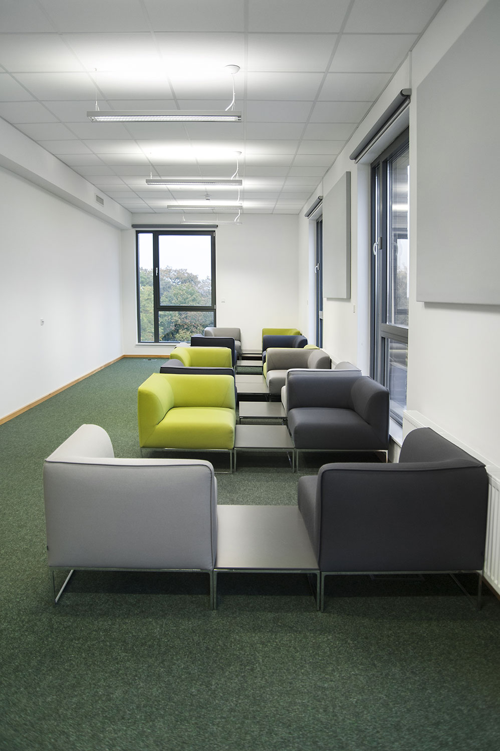 Förutom tekniken är även arkitektur och inredning samtida. Ett genomgående färgkoncept ger en behaglig atmosfär att studera och arbeta i.