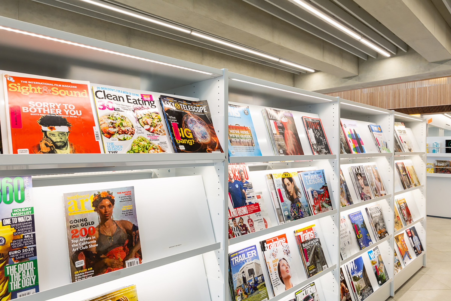 Vi har levererat vårt Slimline hyllsystem som anpassats för att möta kraven från både arkitekter och bibliotek. Hyllorna har medvetet hållits ganska låga så att de flesta besökare kan se över dem. LED-belysning har installerats på varje hyllplan där armaturer och kabeldragning är i de närmaste osynliga. Samtliga trädelar till hyllsystemen har producerats med miljöklassade skivmaterial utan tillsatt formaldehyd för att bidra till bibliotekets ”LEED Gold” status.