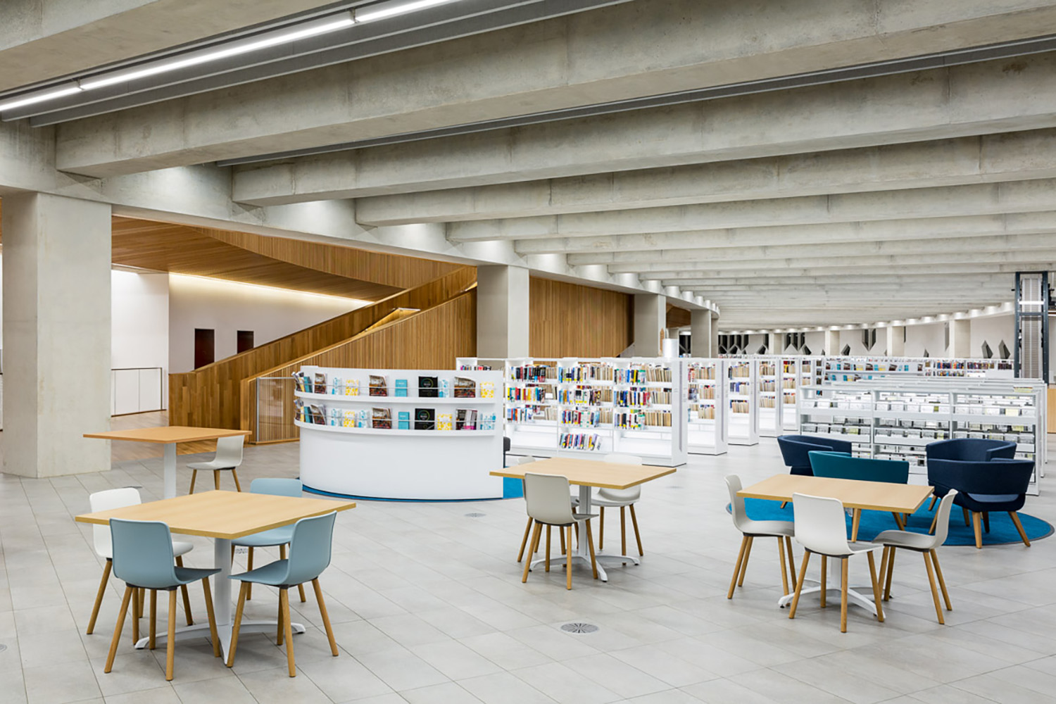 Den nya biblioteksbyggnaden har gott om platser för att läsa och studera, stora avdelningar för barn och ungdomar, mer än 30 mötesplatser, en cafeteria, en 350-personers aula och 7.000 kvadratmeter utomhus för möten och bekväma sittplatser.