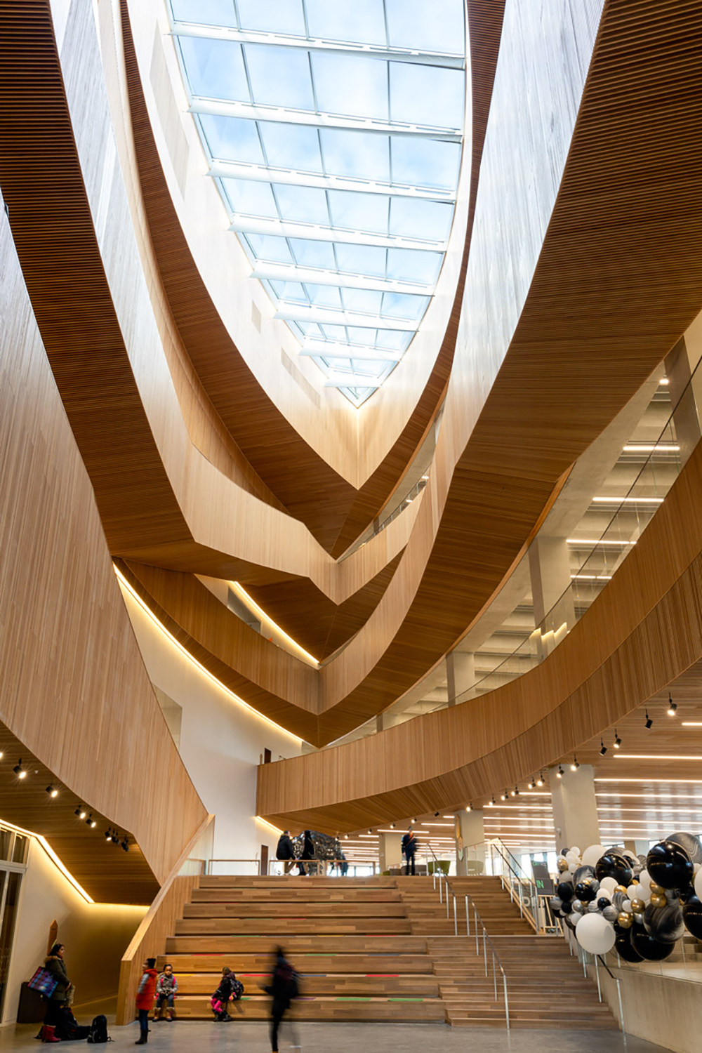 Besökarna kommer in i ett gigantiskt atrium med enorma takfönster och till trappor som låter dem se alla våningar och ända upp till himlen. De mjukt rundade formerna på träet som använts i byggnadssnickerierna skänker värme samt hjälper till att kontrollera akustiken i det väldiga rummet.
