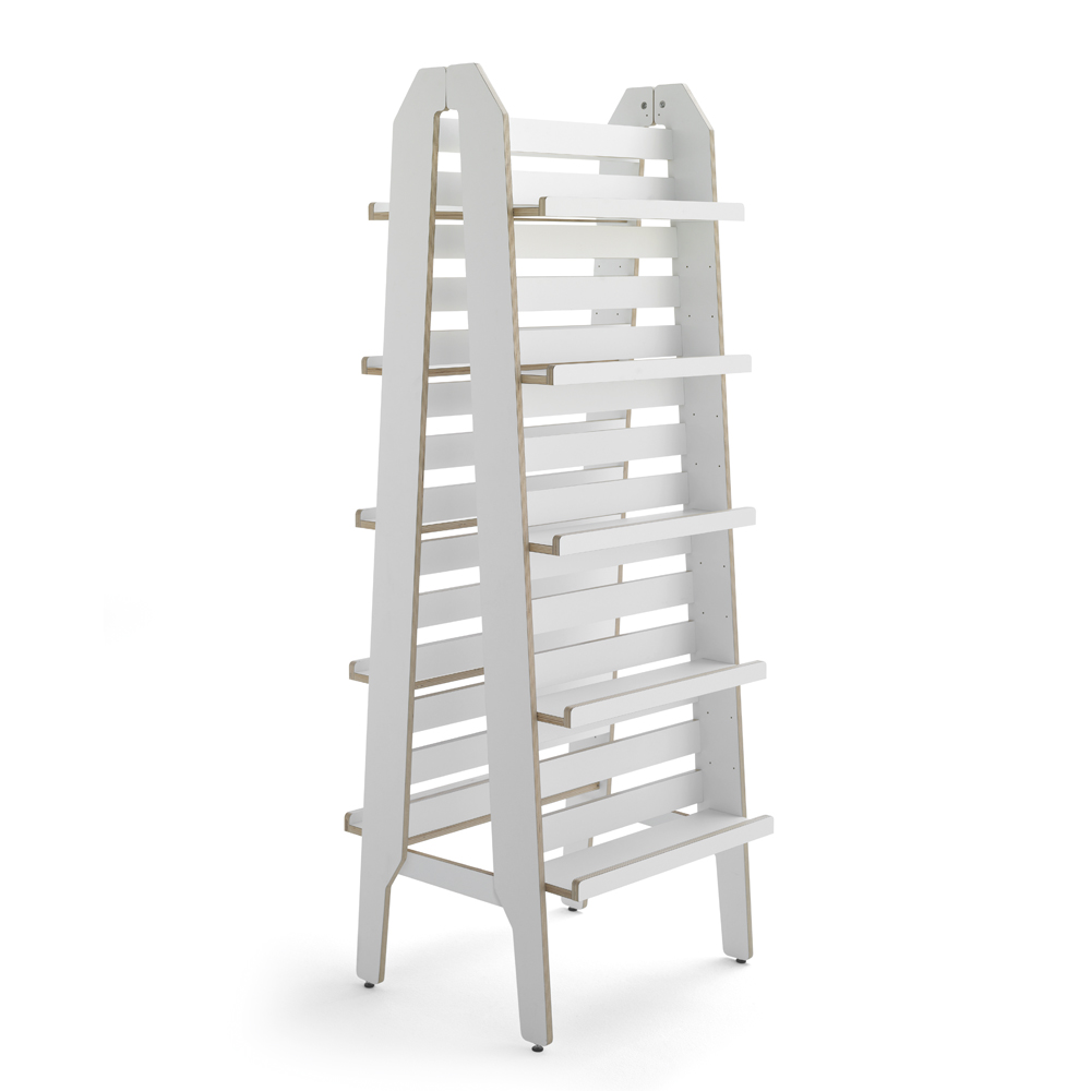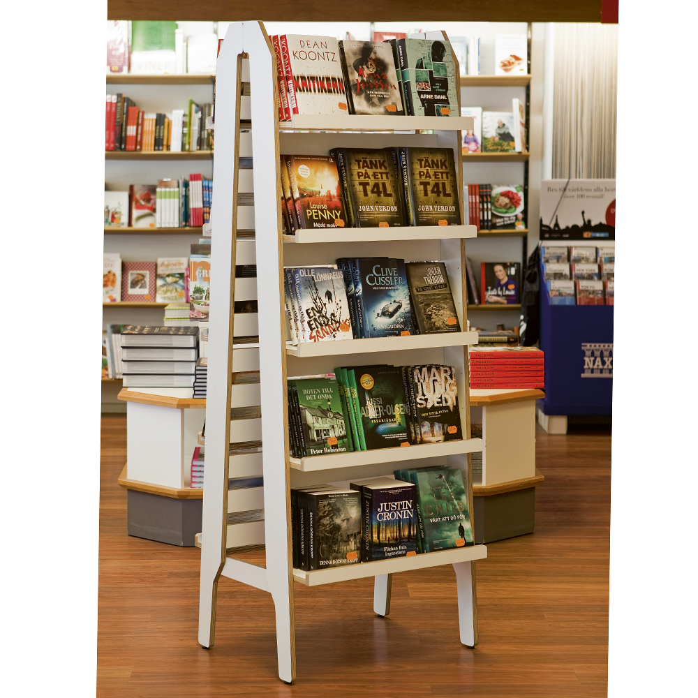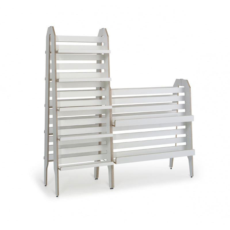 När du vill visa allt och lite till… Dubbelsidig Showalot Ladder, här som ett färdigt paket för dig som vill ha en fristående enhet . Allsidiga, flexibla och byggbara moduler för frontexponering av böcker och bilderböcker eller till förvaring av pocketböcker, talböcker med mera. Går även att dela på och använda varje del lutad mot vägg. Utrustad med 10 flyttbara hyllplan med framkantslist (hyllplanen är något justerbara i djupled). Ändra och flytta runt allt efter behov.