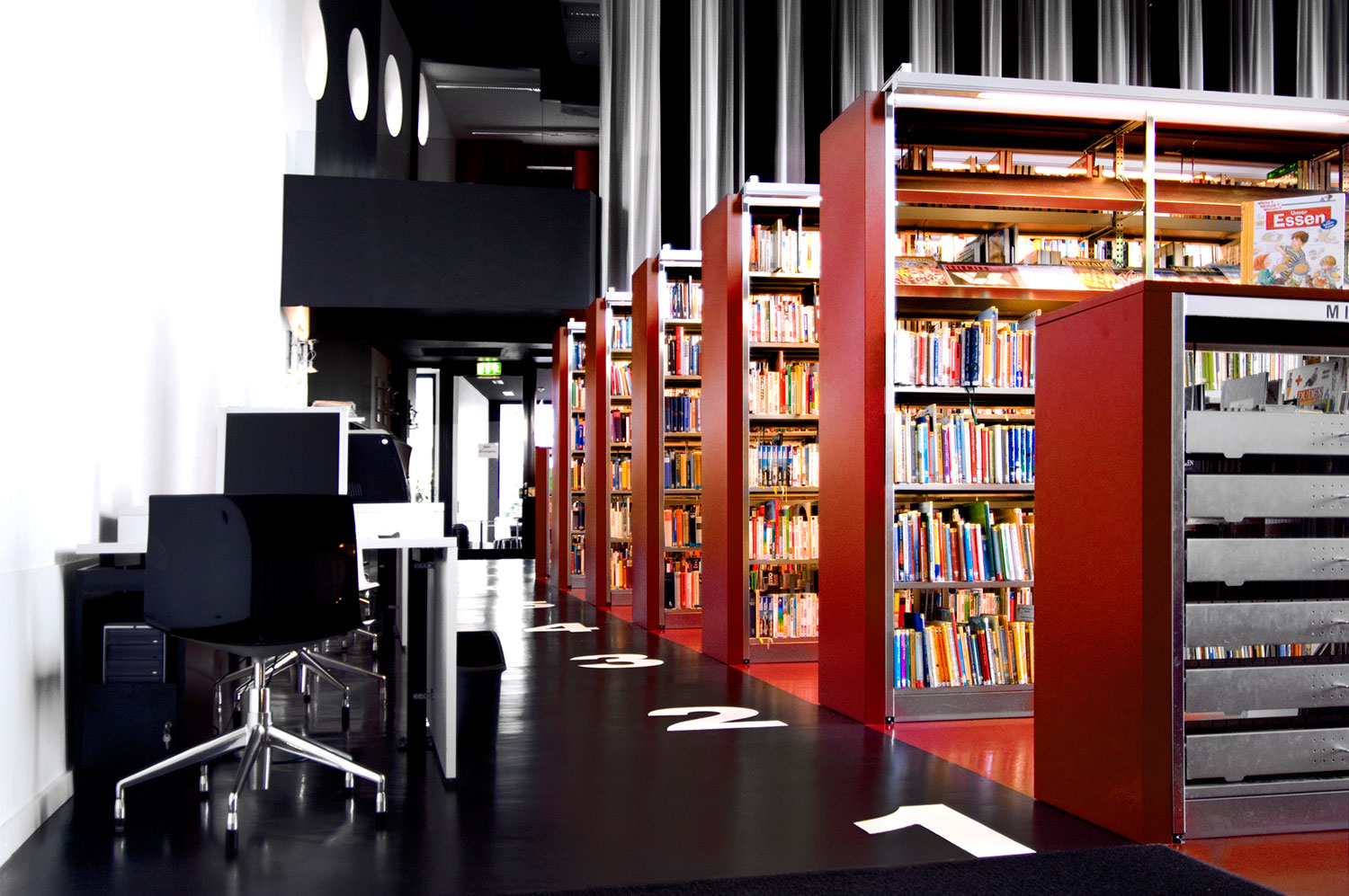 Uniflex hyllsystem finns enkel- och dubbelsidig, där båda varianterna har möjlighet till höjdförlängning från 2250 mm (standard) upp till 3675 mm som mest. Hyllplan finns både i metall och trä, och många funktioner kan läggas till för att tillgodose just ditt biblioteks behov.
